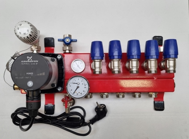 Vloerverwarming met kunststof verdeler voor de warmtepomp.